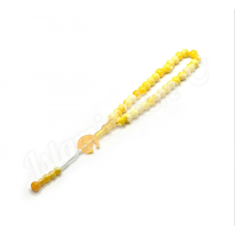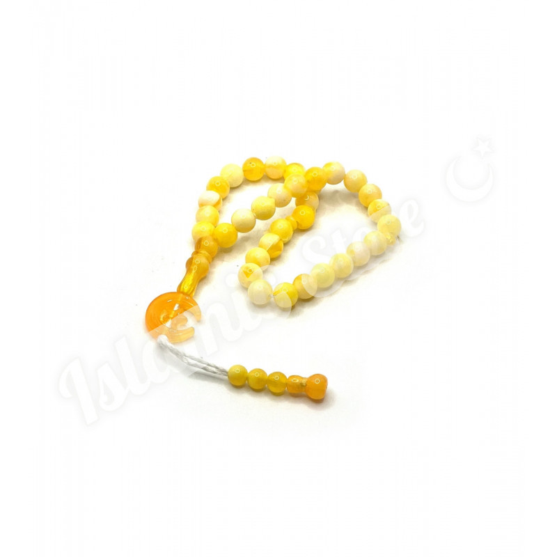 Четки-Тасбих с желто-мраморными круглыми бусинками и полумесяцем. 33 бусинки, которые нанизаны на капроновую нить и крепко перетянутые узлом с полумесяцем на конце. 33 бусинки на четках поделены на три части, каждые 11 бусинок поделены узкой бусинкой, (для различных вариантов и формул поминания Аллаха).