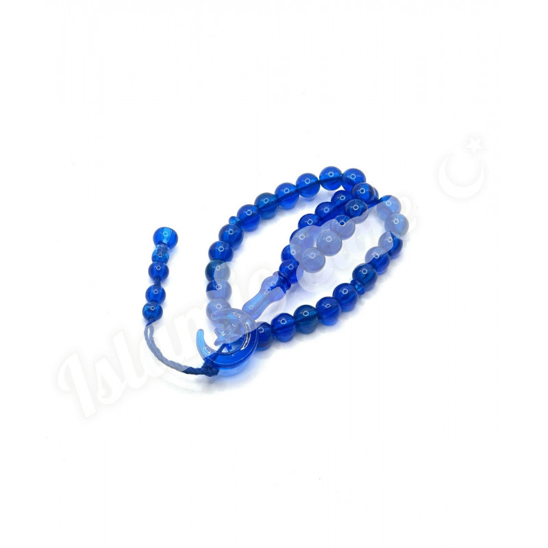 Четки-Тасбих с синими круглыми бусинками. и звездой. 33 бусинки, которые нанизаны на капроновую нить и крепко перетянутые узлом с полумесяцем на конце. 33 бусинки на четках поделены на три части, каждые 11 бусинок поделены узкой бусинкой, (для различных вариантов и формул поминания Аллаха).