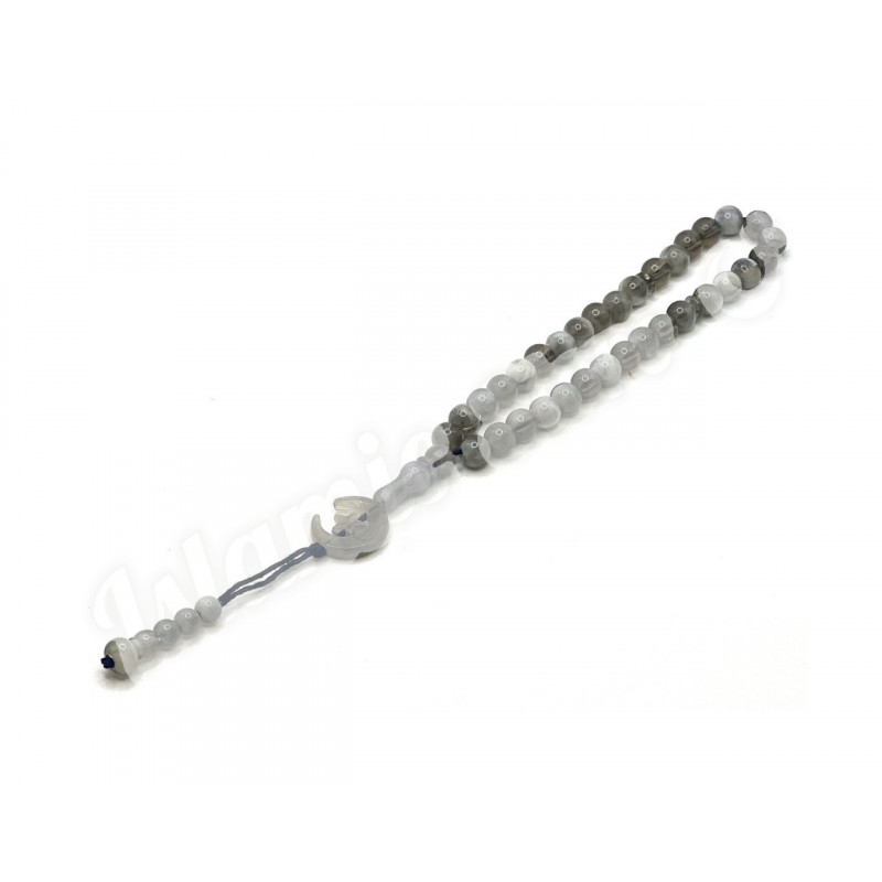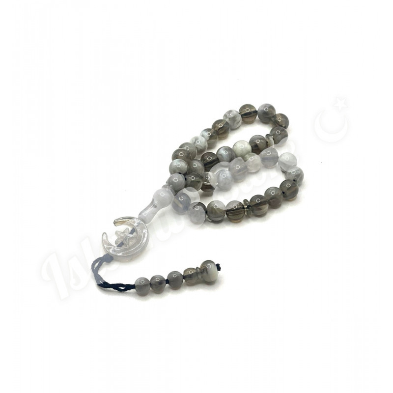 Четки-Тасбих с серо-мраморными круглыми бусинками и полумесяцем. 33 бусинки, которые нанизаны на капроновую нить и крепко перетянутые узлом с полумесяцем на конце. 33 бусинки на четках поделены на три части, каждые 11 бусинок поделены узкой бусинкой, (для различных вариантов и формул поминания Аллаха).