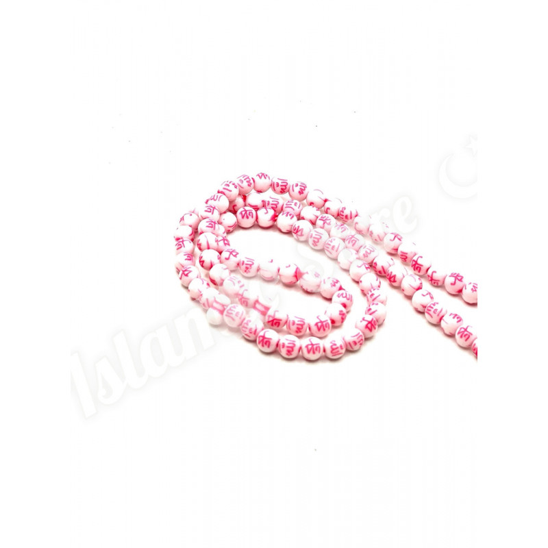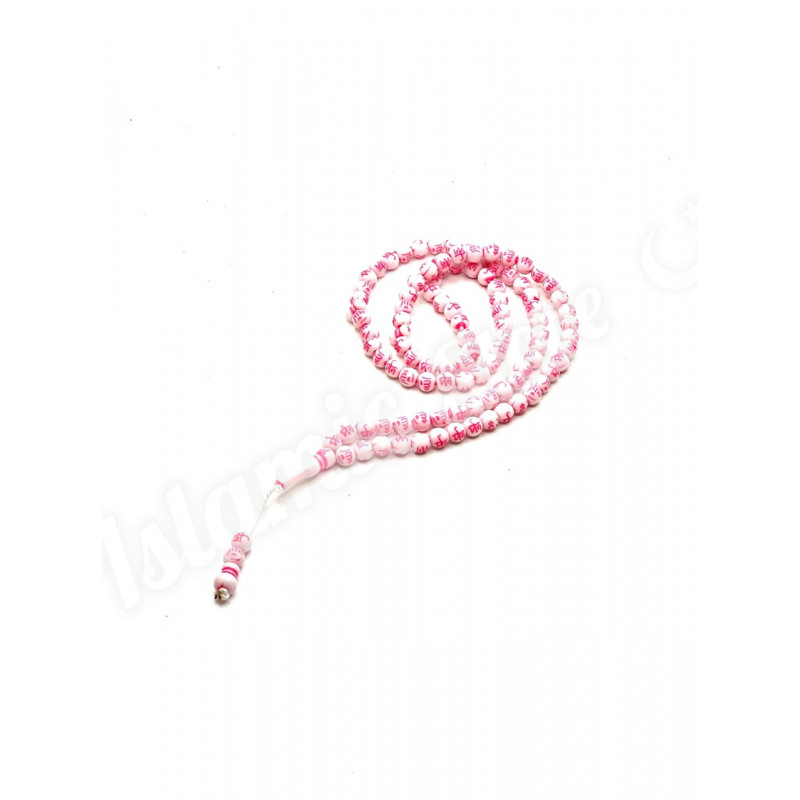 Четки-Тасбих Белый с Розовым написанием Аллах и Мухаммад (Мир ему) 99 бусинок, которые нанизаны на капроновую нить и крепко перетянутые узлом. Удобные для поминания Всевышнего Аллаха и видению счета.