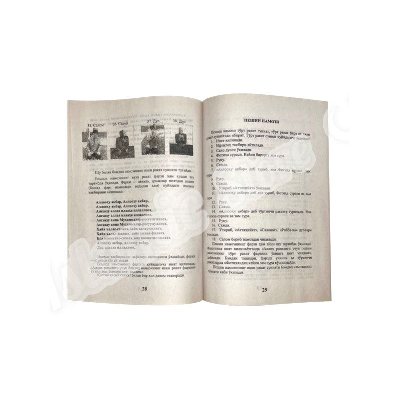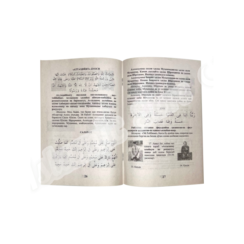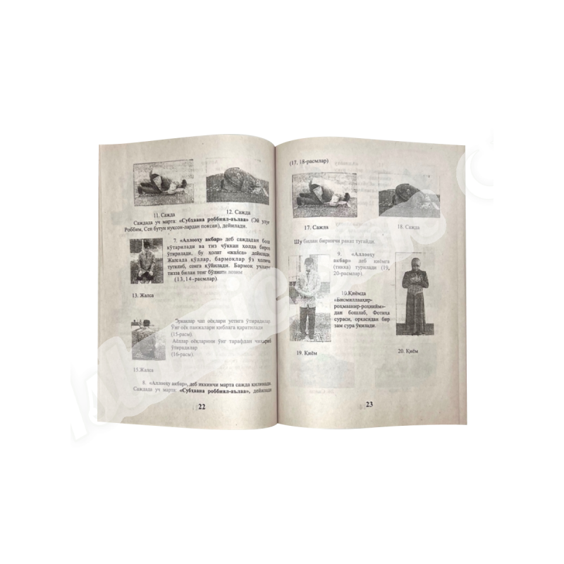Книга - брошюра на узбекском языке поможет вам научиться совершать намаз и брать омовение. В книге подробно описаны действия, совершаемые в намазе, какие именно суры необходимо для этого знать. Все это сопровождается подробными картинками.