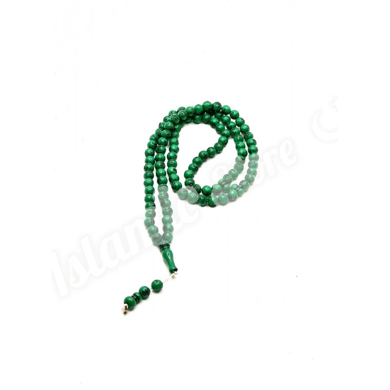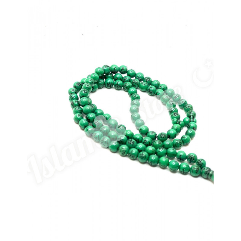 Четки-Тасбих написанием Аллах и Мухаммад (Мир ему) 99 бусинок, которые нанизаны на капроновую нить и крепко перетянутые узлом. Удобные для поминания Всевышнего Аллаха и видению счета.
