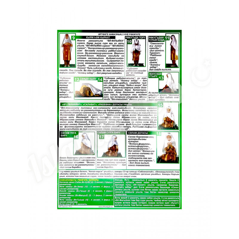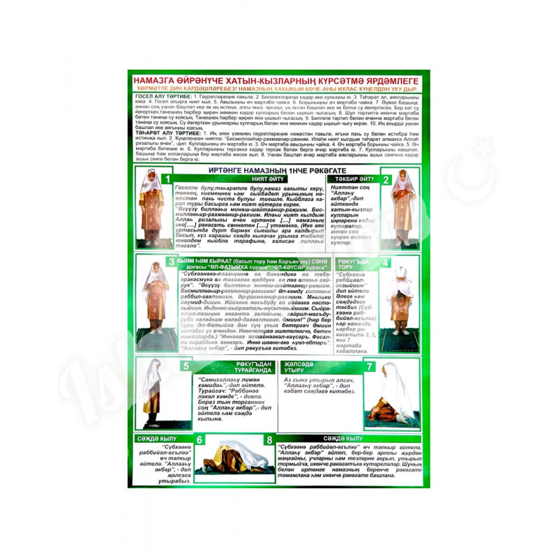 Ярдәмлек хатын-кызларга намаз һәм тәһарәтне дөрес һәм уңайлы рәвештә үзләштерү өчен төзелгән. Плакат ике яктан төсле басылып.
