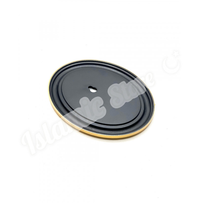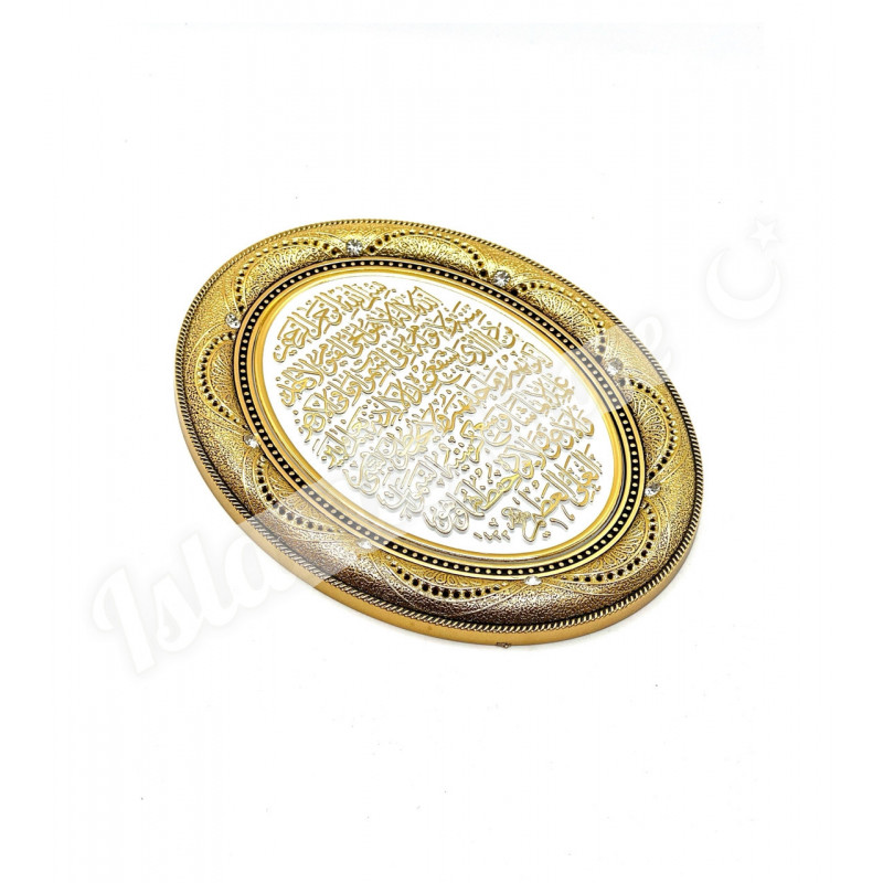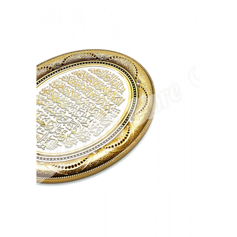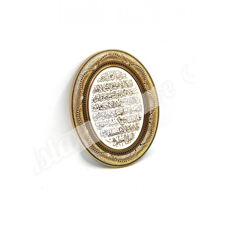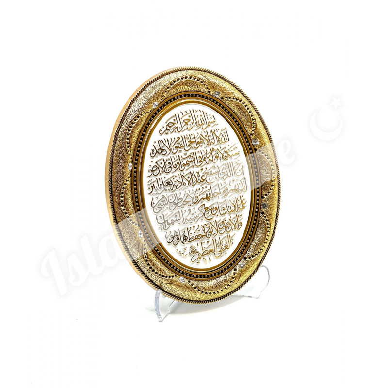 · Дизайн: Овальная форма, золотистая рамка, белое поле с аят аль-Курси золотыми буквами.