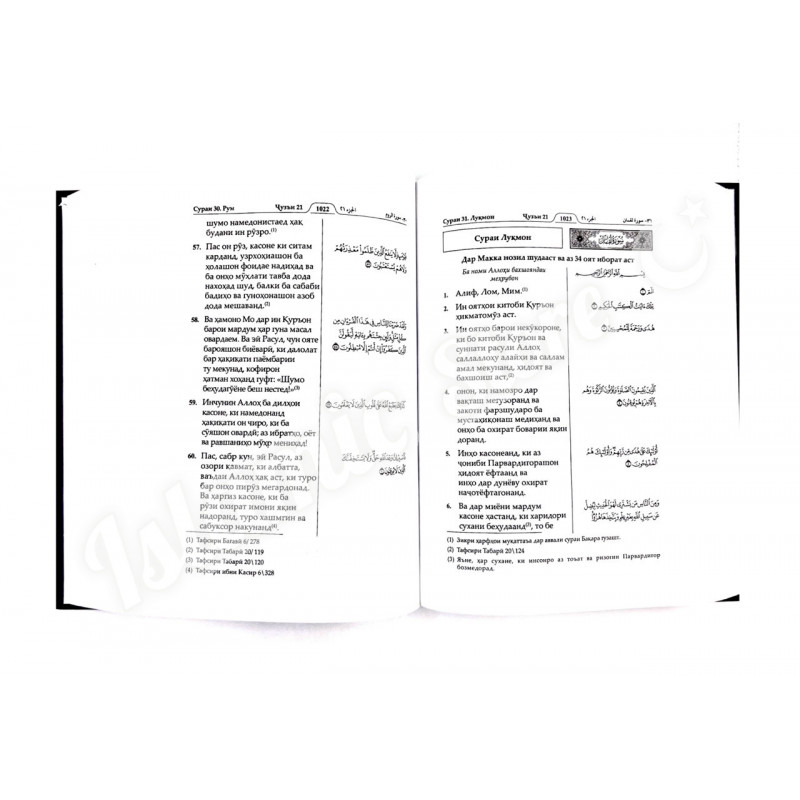 Дар ин нашр, матни аслии арабии Қуръони Карим бо хати осонхонда дар канори тарҷумаи рост ва фаҳми маъноҳо бо истифода аз усули тафсирии "Муяссар" ҷой дода шудааст. Ин равиш барои фаҳмиши осони оятҳо ва дарки паёми илоҳӣ тартиб дода шуда, барои хонандагон аз ҳама сатҳи дониш дастрас мебошад.